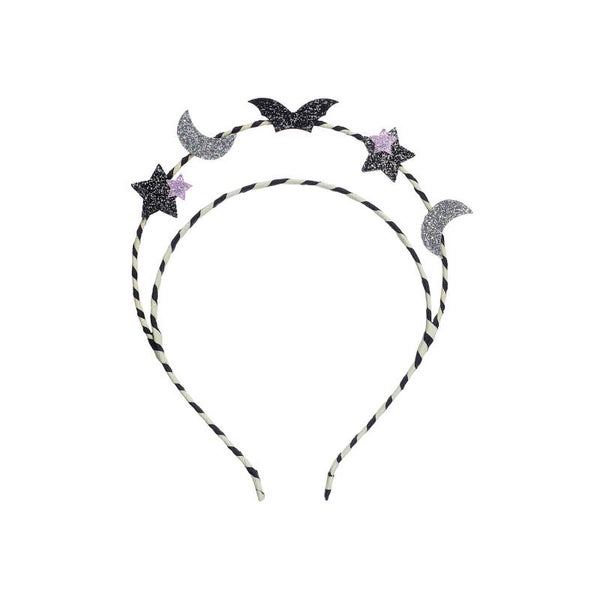 Our spooky halloween headdress is adorned with sweet and spooky halloween charms! Featuring our glittery bat, shimmering moon and stars, this headband is wrapped in stripy black and white grosgrain ribbon. The perfect headband for trick or treating!