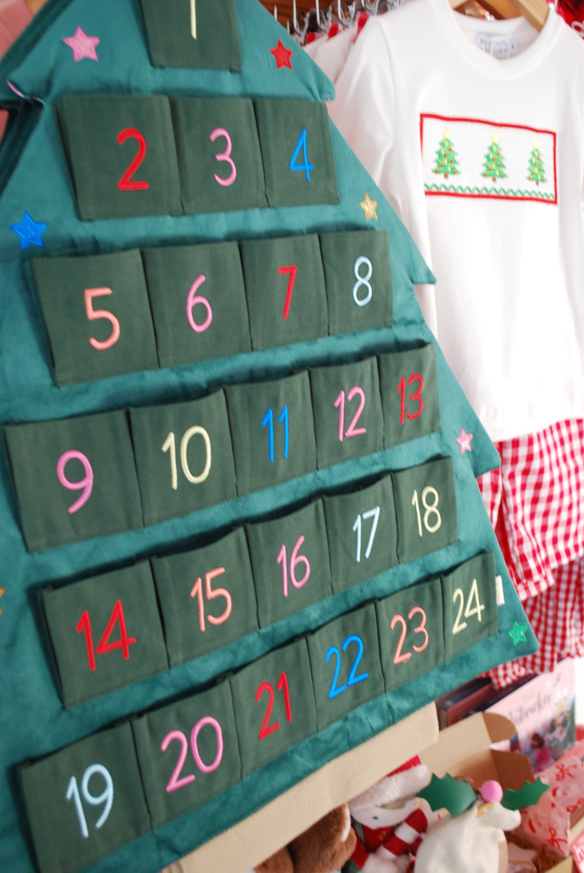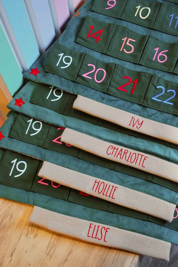 Our gorgeous re-useable advent calendar has 24 roomy pockets ready to fill with sweets, treats and plenty of Rockahula clips or ponies! Made from super soft velvet and shaped like a Christmas tree, this calendar is adorned with a gold star topper and brightly coloured glitter stars! Each pocket is embroidered with colourful numbers - making it super fun on the countdown to Christmas!