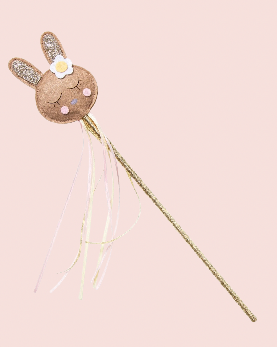 Create a little magic with this adorable Bunny Wand! With a fabric wrapped centre stem, and soft coloured grosgrain streamers this wand is perfect for summer adventures, imaginative play, or a fun addition to the dressing up box. Made with recycled felt and glitter.